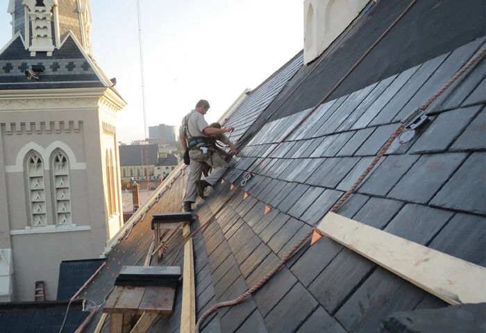 The congregation of Westminster Presbyterian Church is as committed to serving in its downtown home as it is to preserving their beautiful building. In two phases over the course of 4 years, we replaced all of the slate and sheet metal on the spire and main roof.