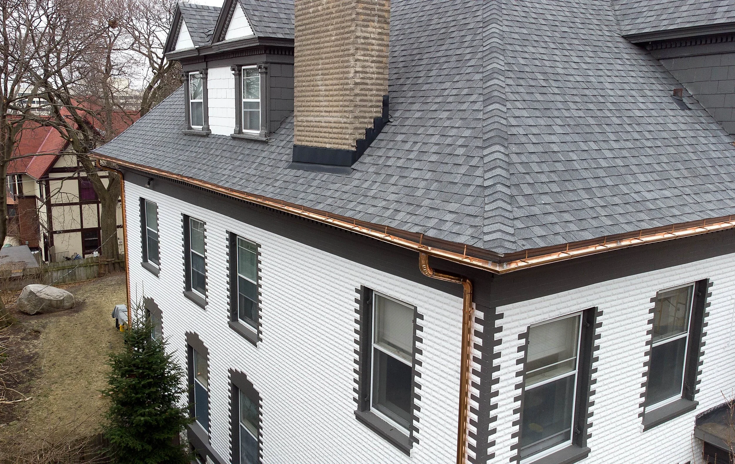 Built-in gutters are found in two types, those that sit below the surface of the roof so water flows down into them, and “curb” gutters that sit on the surface of the roof so water is blocked and diverted toward the outlet. The curb style is also called an “arris” gutter or a “Yankee” gutter. Here in West Michigan, curb gutters are less common than true gutters. In addition to catching water, on a slate roof both gutter styles can also function as a means of catching broken slates as they slide off the roof. Both may also help with keeping large avalanches of snow from coming down, but snow guards should be installed on roofs where falling snow and ice are a known or suspected hazard.