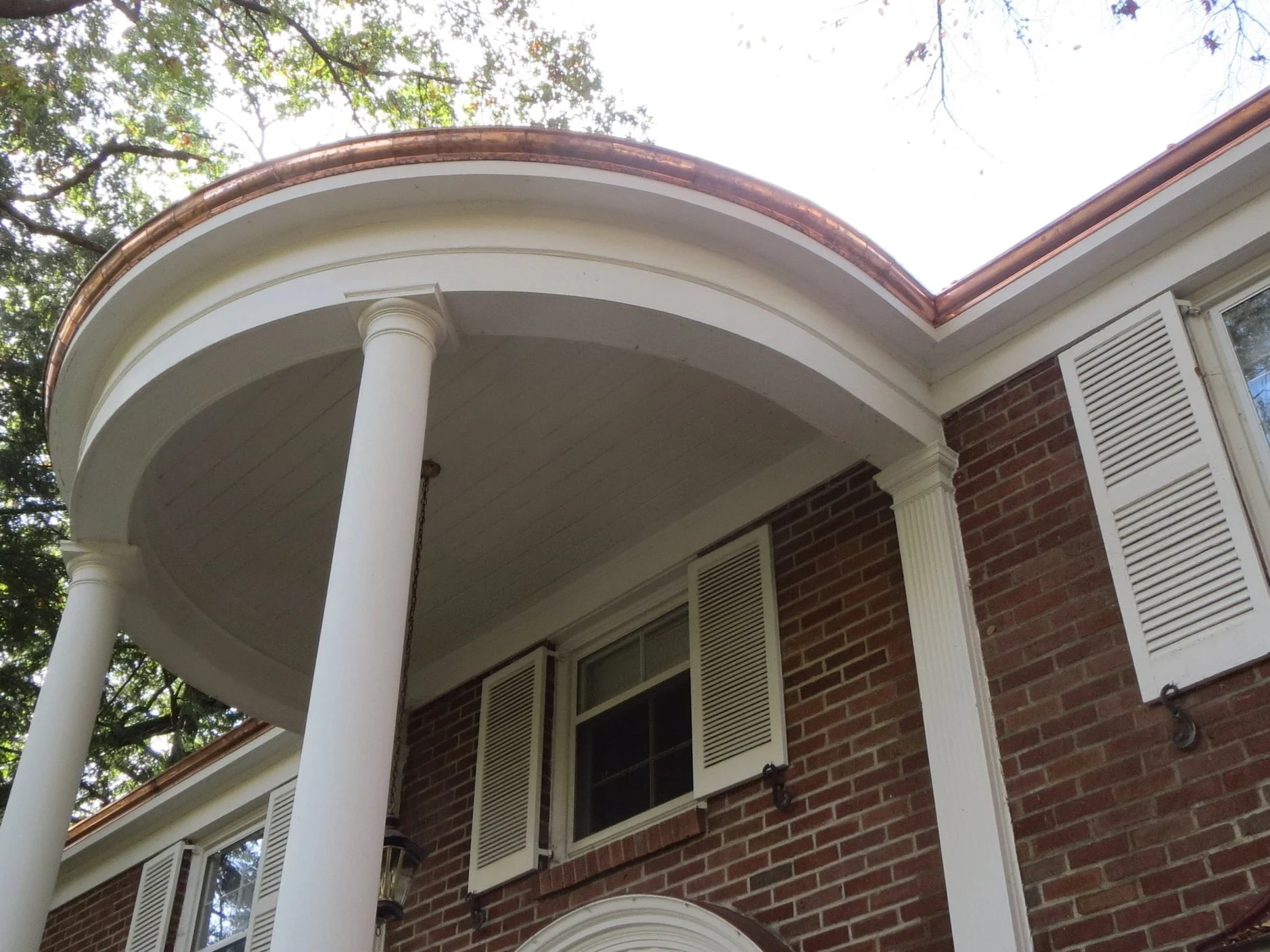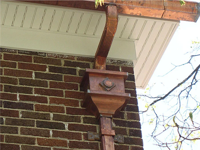 Gutters catch rainwater and meltwater at the bottom of a roof, and direct the water to the ground through downspouts. Collecting water and directing it away from the building helps keep basements dry, eliminates splashing on the exterior of the house, and was once a source of domestic water, usually collected in a cistern. Gutters that are built directly into the roof structure are called “built-in gutters” or “box gutters”. All built-in gutters are framed in wood, with a sheet metal lining of copper, terne, or lead-coated copper. All liner joints must be soldered; caulk may be used only when it is physically impossible to solder, as when attaching to old metal.